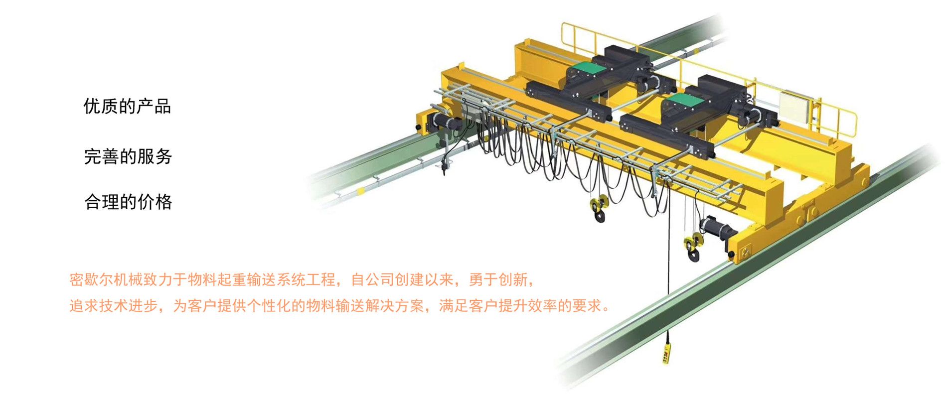 密歇爾起重機械(杭州)有限公司提供全面的起重輸送產(chǎn)品和服務(wù),產(chǎn)品覆蓋環(huán)鏈電動葫蘆(125Kg-80T),歐式鋼絲繩葫蘆,防爆葫蘆,懸臂吊,KBK柔性起重機,歐式起重機,起重馬達(dá),端梁,起重移動供電系統(tǒng)等,在國內(nèi)外被廣泛的應(yīng)用于生產(chǎn)車間,汽車,模具,機械制造,鐵路,船舶,物流搬運,現(xiàn)代化工廠流水線等工業(yè)及其它特殊用途。